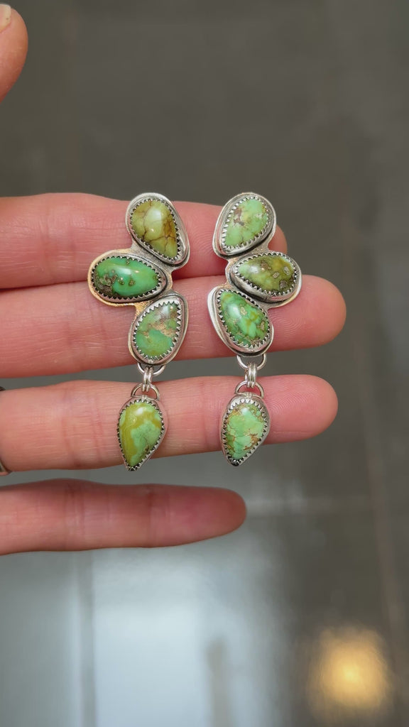 🌿These handcrafted earrings feature genuine Sonoran Gold Turquoise stones in vibrant shades of green with golden matrix patterns. Each gemstone is bezel-set in sterling silver, creating a bold yet elegant dangle design that moves beautifully.